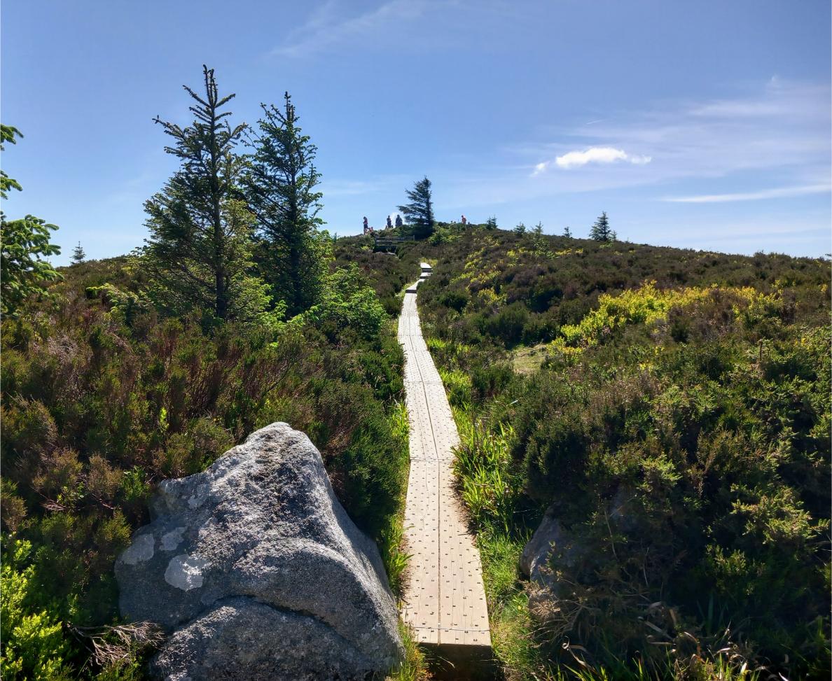 Not far beyond this, you’ll cross a short boardwalk over a boggy patch before rejoining the stony trail. As you gain height, the views start to open up behind you. On a clear day, you can look back across Dublin City, Dublin Bay, Howth Head, and even as far as the Mourne Mountains.